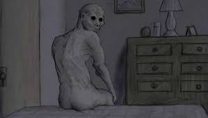 Después de adaptarme a la oscuridad por unos segundos, fui capaz de ver lo que causó la reacción extraña. A los pies de la cama, sentado y de espaldas a nosotros, había lo que parecía ser un hombre desnudo, o un gran perro sin pelo de algún tipo. Su posición corporal era inquietante y poco natural, como si hubiera sido golpeado por un coche o algo así. Por alguna razón, no me asusté, más me preocupaba su condición. En este punto, yo pensaba que teníamos que ayudarle.